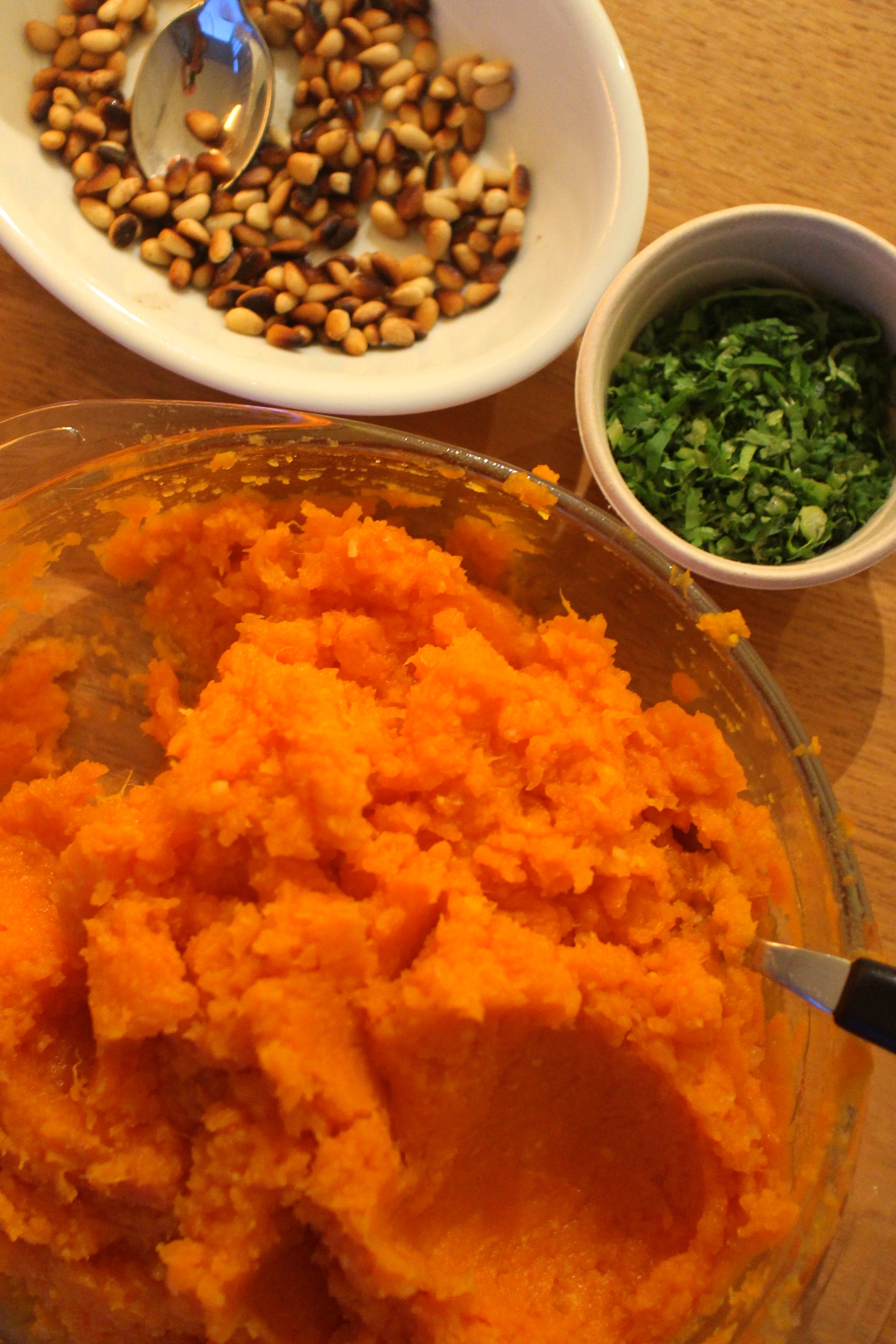 Sweet Potatoes. With garlic, ginger, orange rind and orange juice topped with roasted pine nuts and cilantro. Sounds really odd – but oh so fresh and tasty. Unlike any sweet potato dish I have ever tasted. Mary made them for Thanksgiving and I took a whirl at the for Christmas with mum – and I did pretty well for my first shot at it!