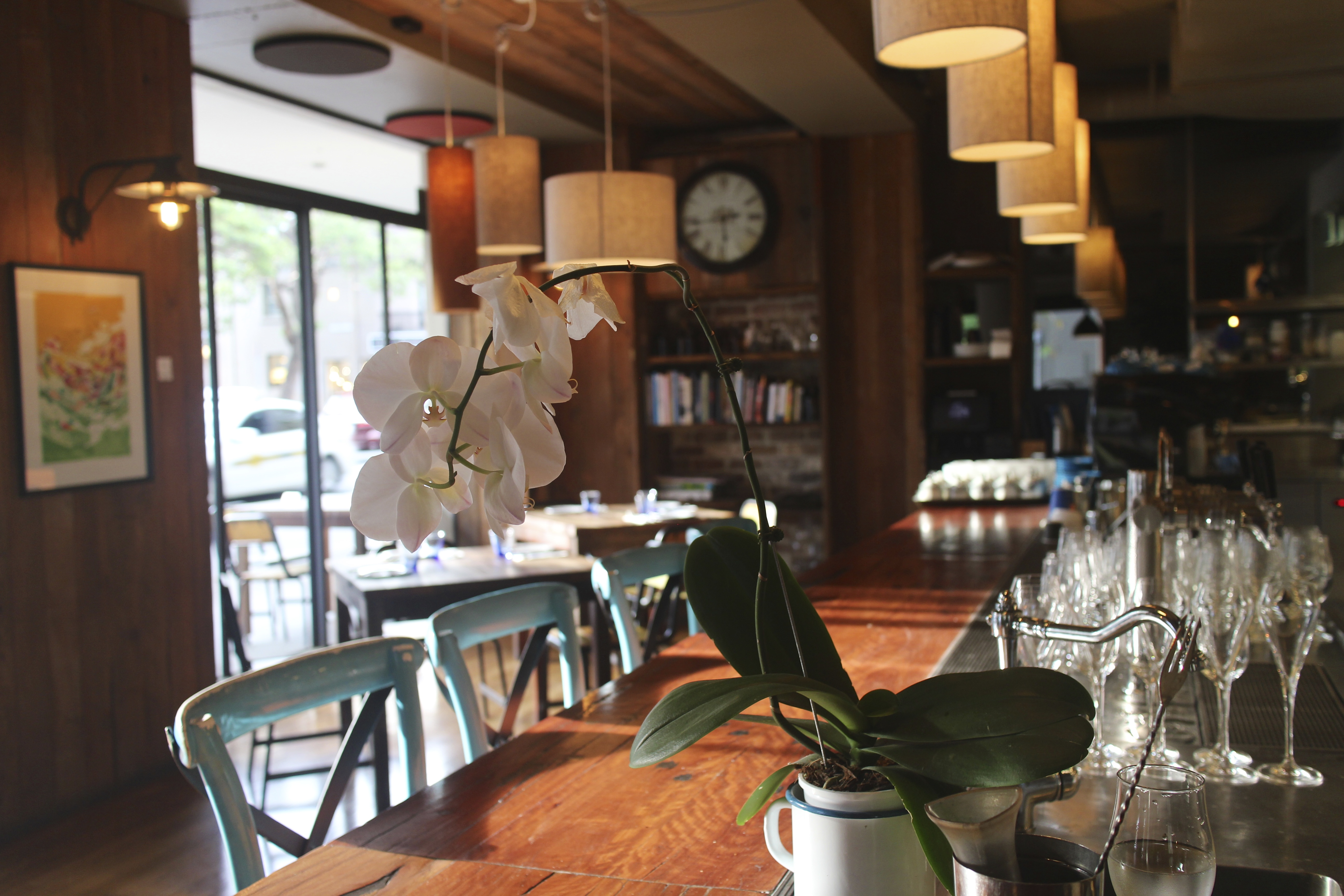 The restaurant was empty. Beautiful end of day light streaming through the window onto the earthy interior. And a single orchid.