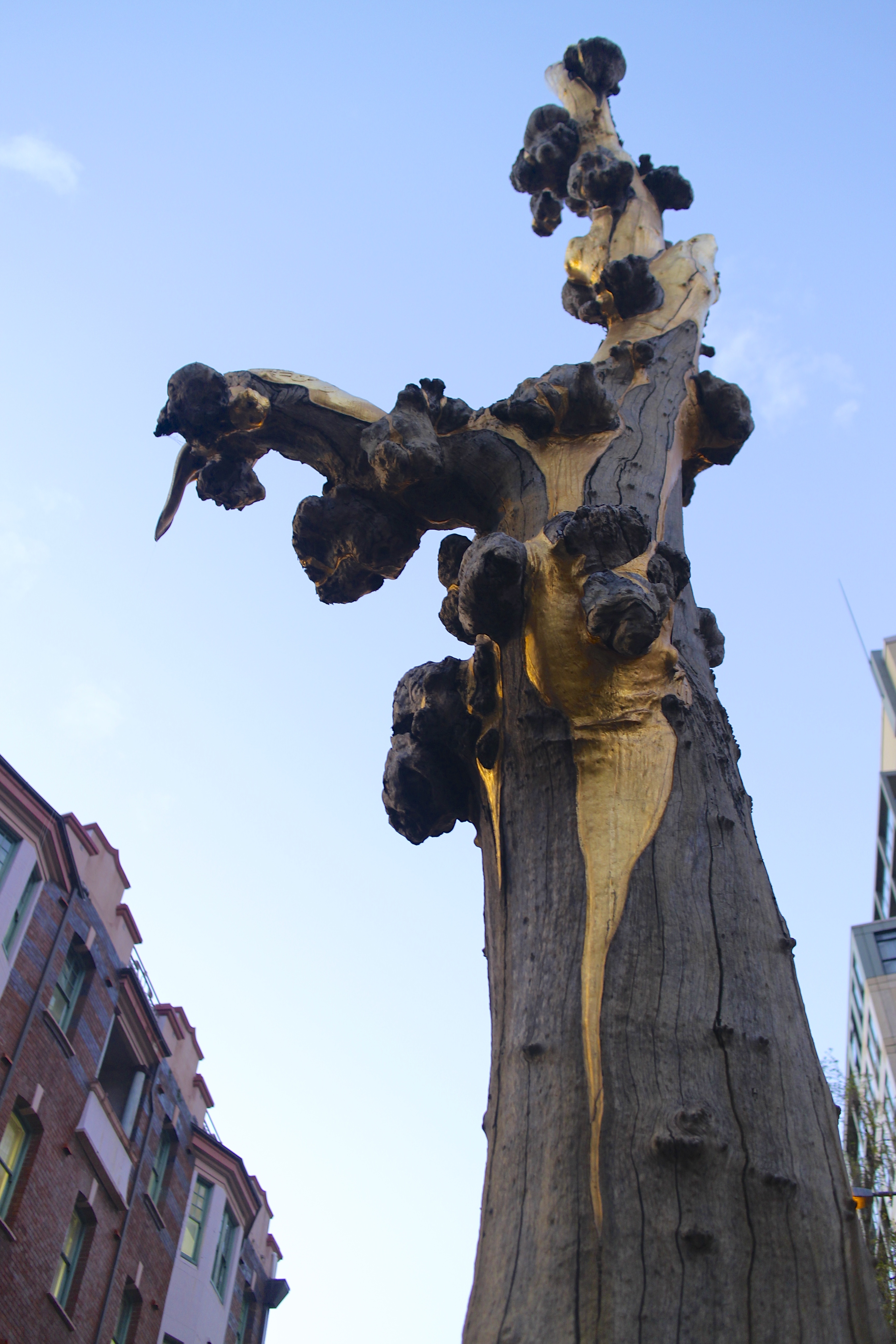This sculptural installation work on the corner of George and Hay streets was created by Chinese artist Lin Li from a 200 year old Yellow Box eucalyptus tree. Gold leaf has been melted onto the tree in a yin yang pattern with perfect harmony through the traditional Chinese principle of Feng Shui. Additionally the other three elements of water, fire and earth have been incorporated into its design along with the wood and gold to create balance and enhance positive energy and encourage good fortune.