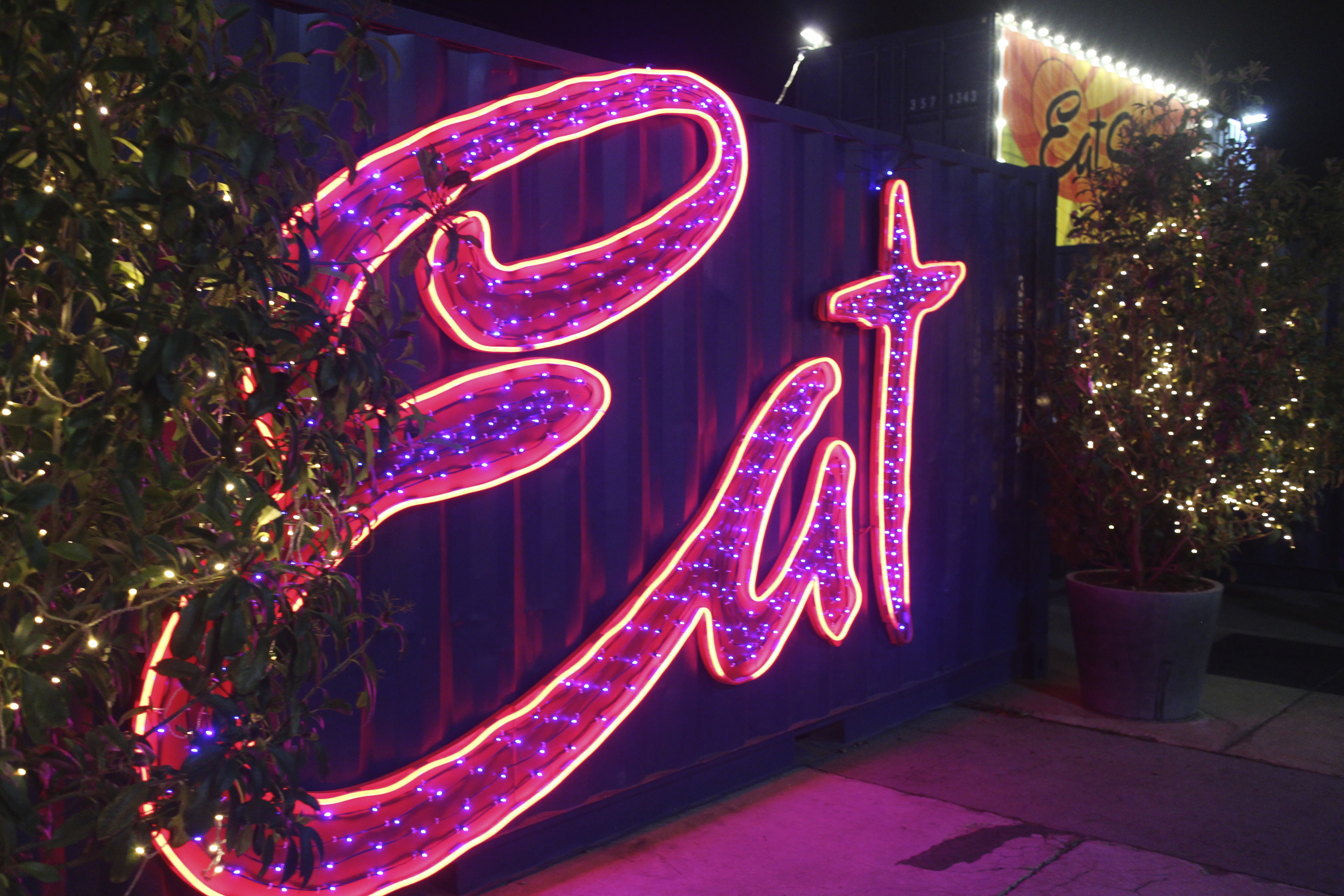 Our favorite dishes were the lamb cutlets, the curly fries with kimchi, beef and cheese and the duck confit salad. I had a great shot of some of the food, but this sign marking the entrance was just too good.