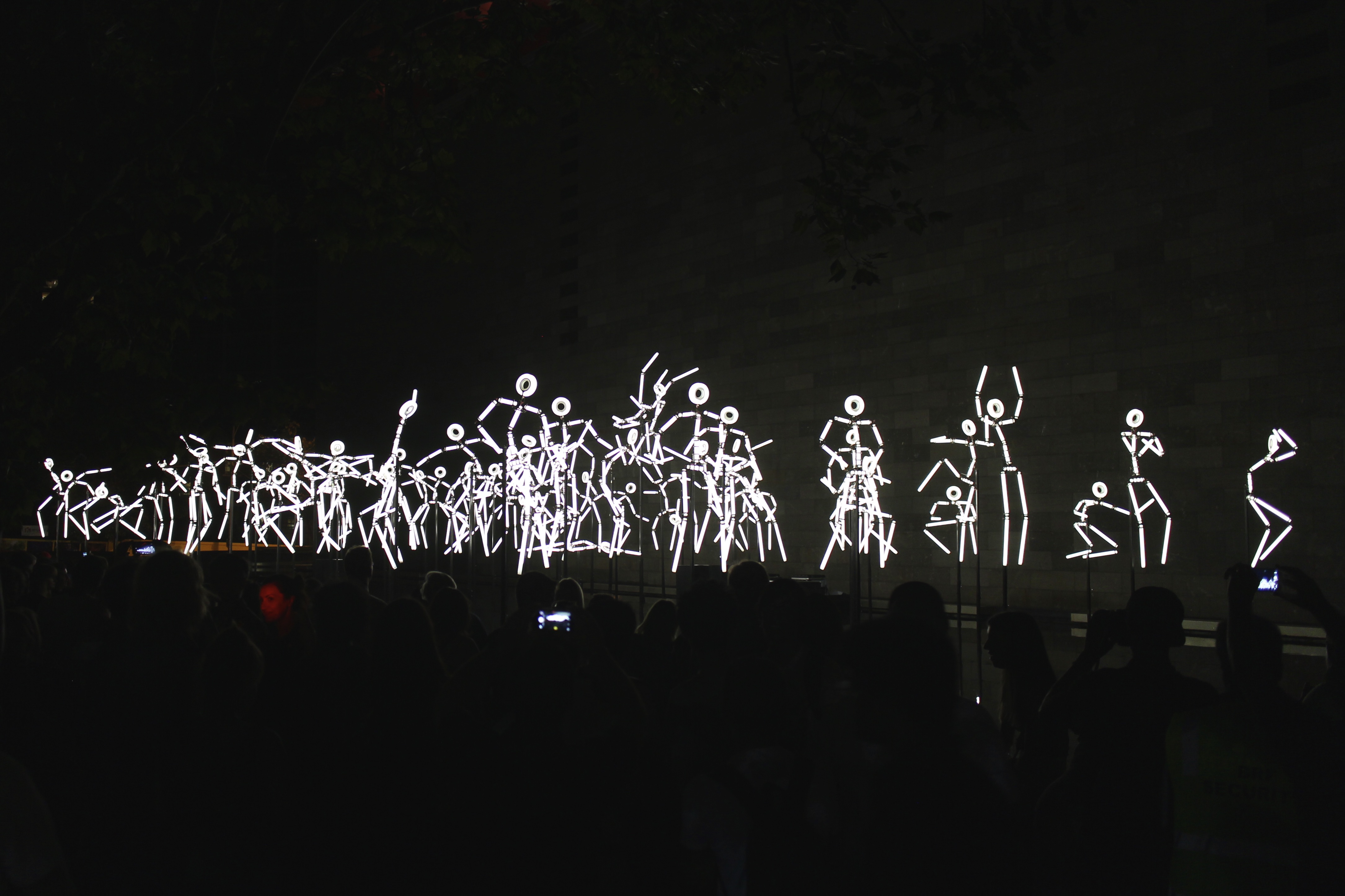 The different bodies would light up with a score and some dialogue to tell serious stories – lots of dancing, running, jumping, etc. This was at the end of the set when they were all lit up. Right in front of the National Gallery of Victoria. Special piece!