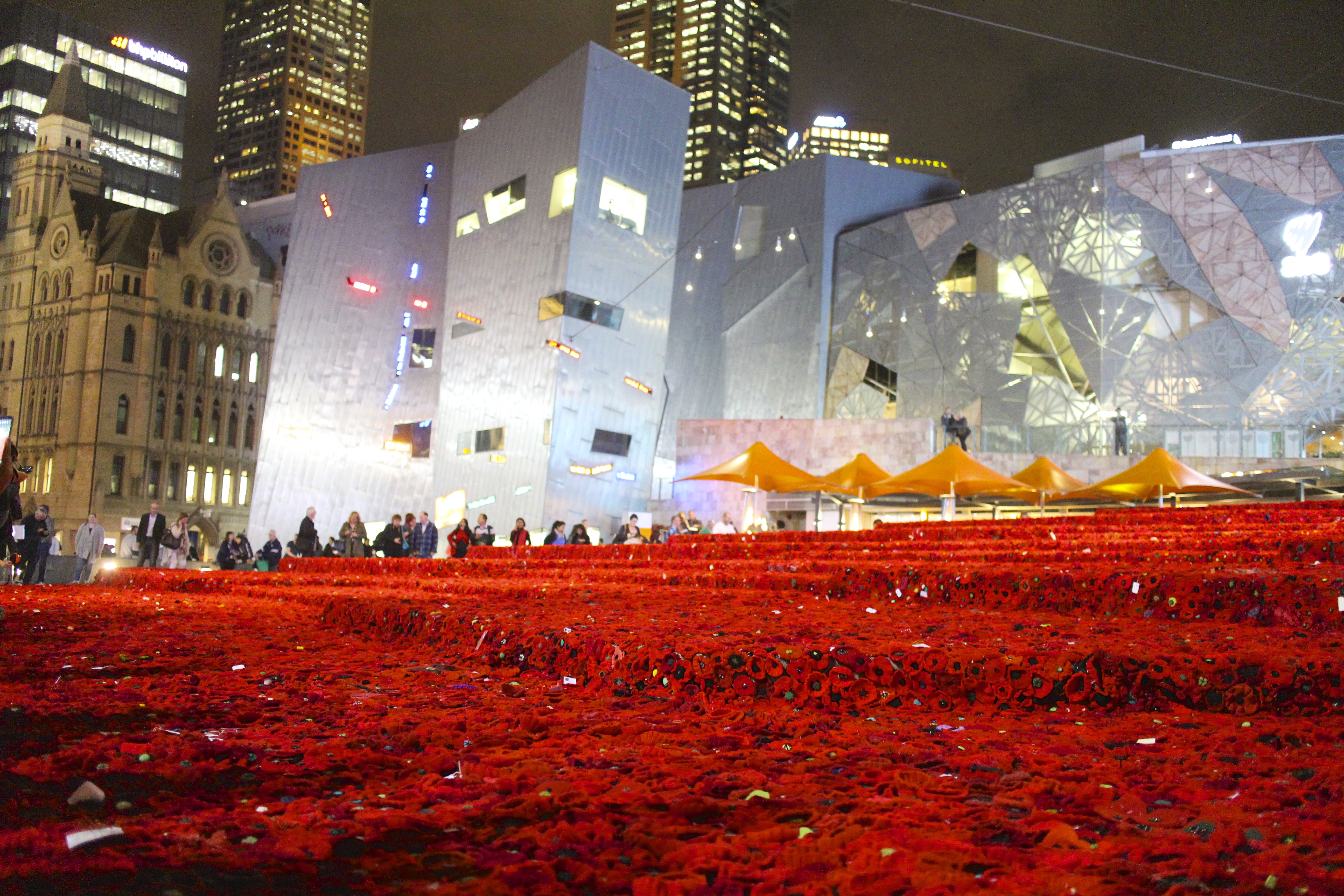 The steps in Federation Square in the heart of Melbourne were covered by handmade poppies – it was a two year project to mark and honor the 100th ANZAC Day.