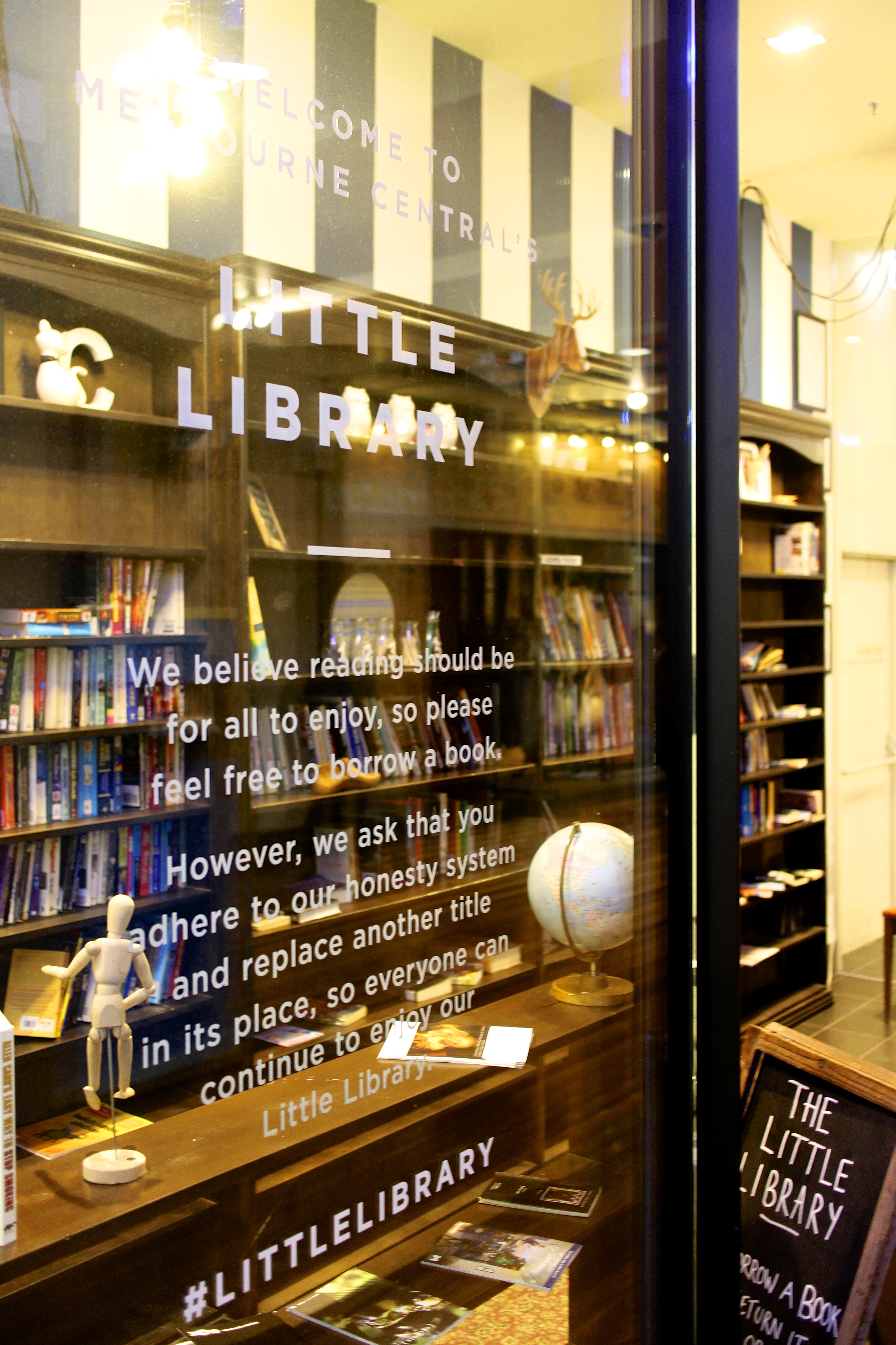 Melbourne Central is a shopping complex in the CBD. In what used to be some sort of storefront, they have set up their Little Library – just a place people can drop off books or borrow them as they see fit.